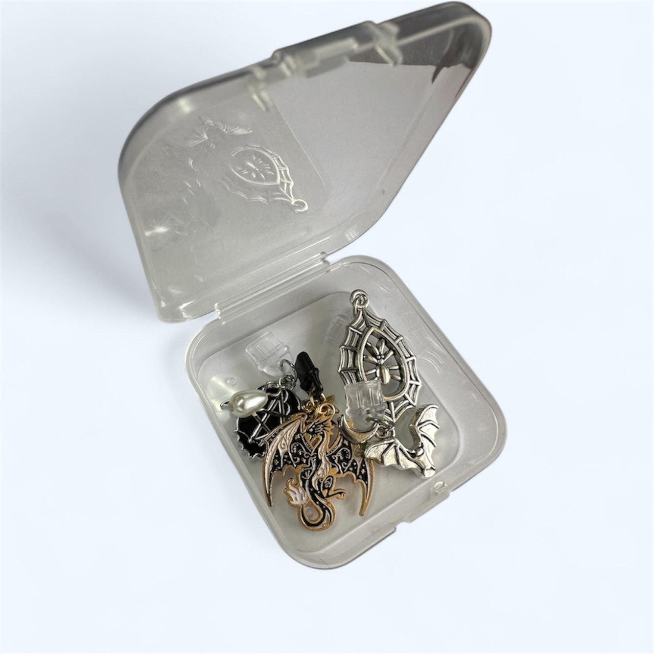 our charm keeper mini case is a clear, lightweight box that’s the perfect size for storing small keychains, earrings, or collectible trinkets.